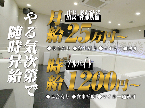 3,000円 最低保証時給3,000円+各種高額バックあり!【レギュラー】 時給:4,000円~5,000円 日給:25,000円~ 【アルバイト】 時給:4,000円~5,000円 日給:25,000円~ ※時給変更のない保証給です。 キャバ嬢デビューの子でもしっかり稼げるキャバクラになってます☆ |