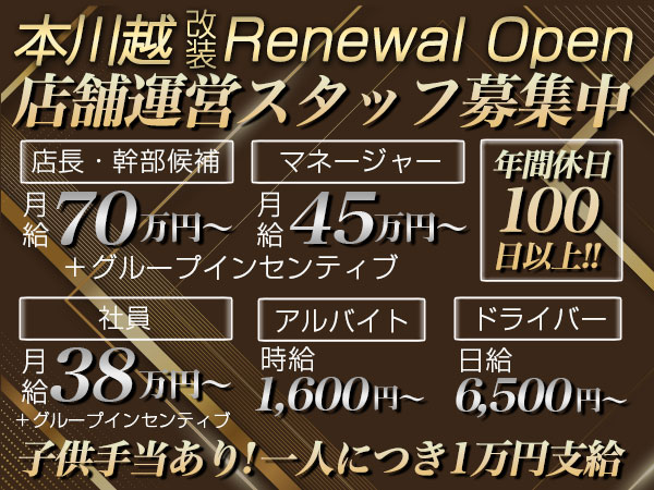 | 職場構成の補足 | 2026年3月2日「本川越」改装リニューアルオープン!【L'ecrin(レカン)】選び抜かれた美人キャストと、こだわりの美空間で極上の休息をお楽しみください。 | |||||||||||||||||||||