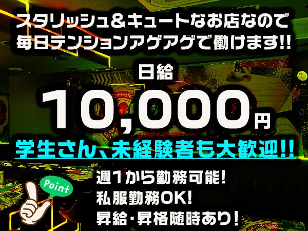 3,000円 体入時給3,000円~本入時給1,500円~2,000円以上+各種高額バックあり ドリンクバック50% 最大50%のその他バックあり |