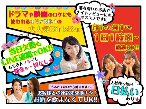 カウンター越しに ドリンクを作ったり 楽しくお話をするだけ** お酒は飲まなくても大丈夫です!! 当店ではほとんどの子が お酒を飲まないのでご安心下さい! |