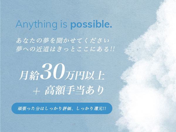 20:00〜LAST 1日何時間〜でも勤務可能♪♪ あなたの都合で出勤OK! 学生さんや昼職をしている女の子にも人気!! もちろん終電上がりもOKです😊 |
